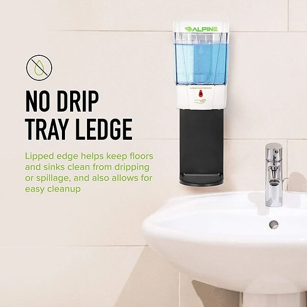 The Alpine Industries universal drip tray easily attaches to soap and sanitizer dispensers to prevent floor cleanup. Simple to assemble and install on a wall or dispenser stand. Its lipped edge is perfect for janitorial staff to clean up directly on the tray. This helps prevent liability slip and falls by protecting the floors from excess soap or sanitizer. Includes 2 screws and 3M Glue adhesive pad to fit securely in place. Universally designed to attach to most soap and sanitizer dispensers. Compatible with Alpine Industries dispensers. Alpine Industries heavy duty universal soap dispenser drip tray is created to help make life easier and more simple. Its built to be compatible with most soap and hand sanitizer dispensers and allows you be worry free. Its a great alternative to a soap dispenser without a drip tray because that can be messy and inconvenient. It will hold up through long term use and will last you years to come. Plus it reduces your clean up time and keep the floors safe from falls and slips. The drip tray will collect access soap or hand sanitizer making it ideal for high traffic areas like hospitals, schools, restaurants, offices and stores.