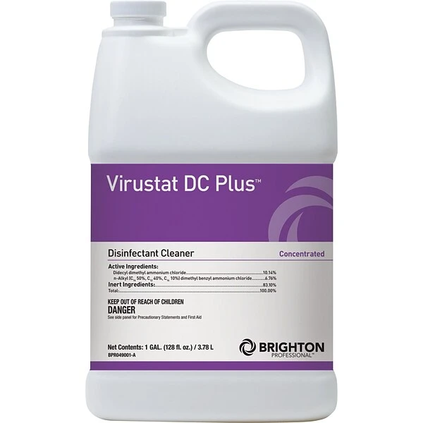 Scrub bathrooms, equipment and other items with this disinfectant cleaner. The concentrated cleaning mix is formulated without phosphates to help keep waterways pollution-free and eliminates MRSA, E. coli and other bacteria to help prevent illness. This Brighton Professional Virustat DC Plus disinfectant cleaner comes with four units in each carton and is highly concentrated, so a single container can create up to 257 ready-to-use gallons.