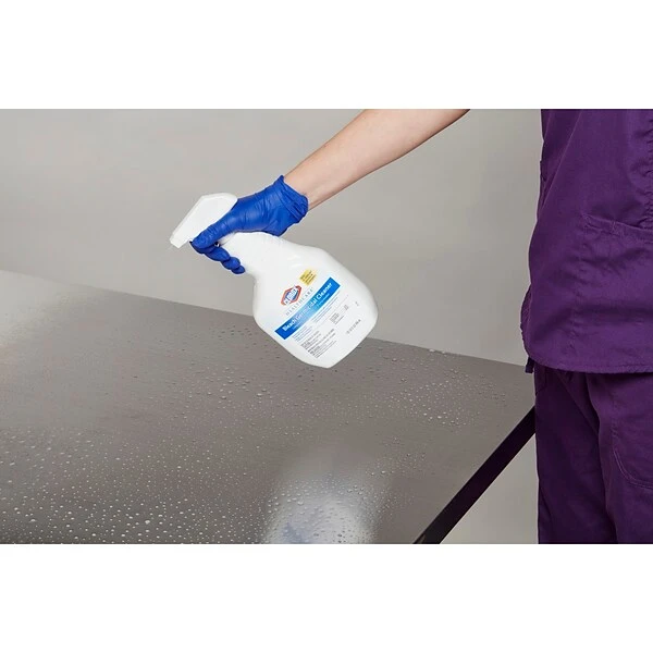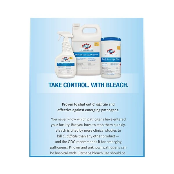 Healthcare professionals trust Clorox Healthcare® Bleach Germicidal Cleaner to help them overcome infection control challenges in a constantly changing healthcare environment. Clorox Healthcare® Bleach Germicidal Cleaner is a ready-to-use, 1-step cleaner-disinfectant containing a 1:10 bleach dilution to meet CDC and OSHA guidelines for disinfecting surfaces in healthcare settings. This cleaner disinfectant is EPA registered to kill over 40 microorganisms, including HAI causing bacteria like MRSA and VRE, outbreak causing viruses such as Influenza A and B viruses, Measles Virus and Norovirus and fungi in 1 minute. It is also EPA Registered to kill Candida auris, considered an urgent antibiotic-resistant pathogen threat by the CDC. This disinfectant kills 99.9999% of C. difficile (C. diff) spores in 3 minutes, according to the current EPA recommended testing standard (June 2014). The ready-to-use disinfectant eliminates compliance risks and labor costs associated with dilutable disinfectants. Designed for easy refilling to meet needs of heavy users. This bleach solution features an anticorrosion agent and is formulated for broad surface compatibility with healthcare surfaces including stainless steel, glass, plastic, porcelain, glazed ceramic, laminated surfaces and vinyl. Intended for use in Healthcare settings.