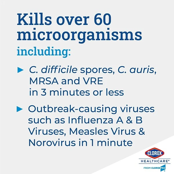 Healthcare professionals trust Clorox Healthcare® Bleach Germicidal Wipes to help them overcome infection control challenges in a constantly changing healthcare environment. Clorox Healthcare® Bleach Germicidal wipes are ready to use, 1 step cleaner containing a 1:10 bleach dilution to meet CDC and OSHA guidelines for disinfecting surfaces in healthcare settings. Designed for discharge disinfection, large areas. These terminal wipes are EPA registered to kill a total of 58 microorganisms, including HAI causing bacteria like MRSA and VRE in 30 seconds, outbreak causing viruses such as Influenza A and B viruses, Measles Virus and Norovirus in 1 minute and C. difficile (C. diff) spores, TB and fungi in 3 minutes. These wipes kill 99.9999% of C. difficile (C. diff) spores, according to the current EPA recommended testing standard (June 2014). And they meet EPA criteria for use against SARS-CoV-2, the virus that causes COVID-19. These wipes are engineered minimize residue and leave less visible residue on surfaces vs. competitor bleach wipes. These ready-to-use wipes are formulated with an anticorrosion agent and are compatible with common healthcare surfaces including stainless steel, glass, plastic, porcelain, glazed ceramic, laminated surfaces and vinyl. Intended for use in Healthcare settings.