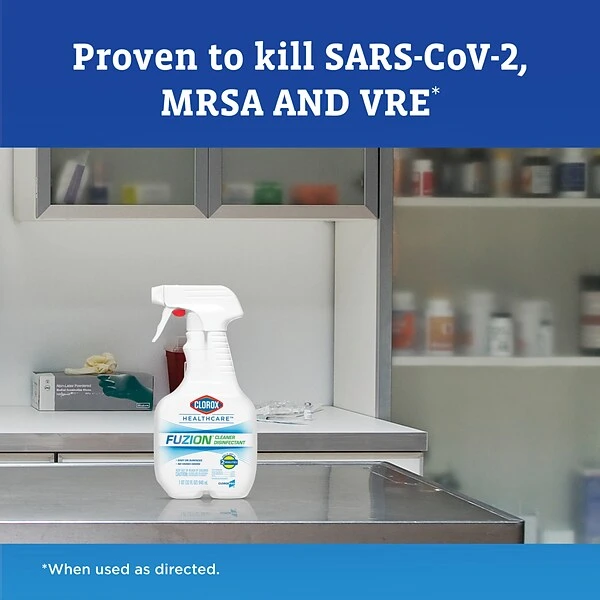 - FUZION CLEANER: Clorox Healthcare Fuzion Cleaner Disinfectant is a one-step cleaner and disinfectant with bleach that’s fast acting and ready to use; Package may vary