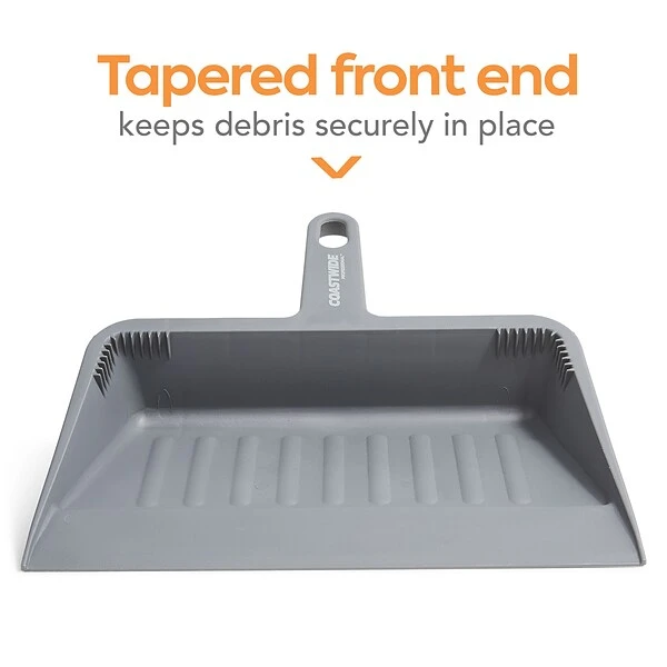 Pair a Coastwide Professional counter brush with this dustpan for a complete cleaning solution. The heavy-duty plastic construction stands up to frequent use, while the tapered front end keeps debris securely in place as you sweep. This Coastwide Professional heavy-duty dustpan features an integrated hanging hole for convenient storage on a janitorial cart or in a cleaning closet.