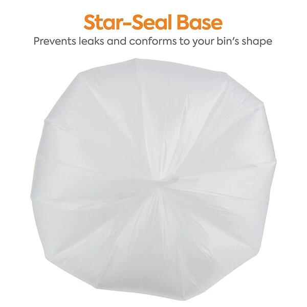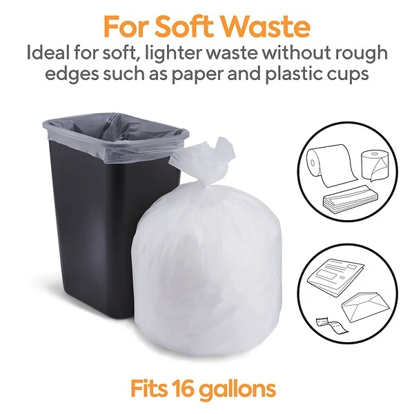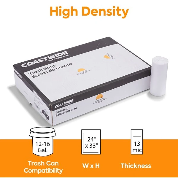 Get rid of office waste with these trash bags. The high-density polyethylene construction offers impressive lifting strength, while the natural clear material lets you inspect contents to prevent accidental loss. These Coastwide Professional™ 12-16 gallon high-density trash bags have star-sealed bottoms that ensure even weight distribution and help prevent leaks when disposing of wet items.