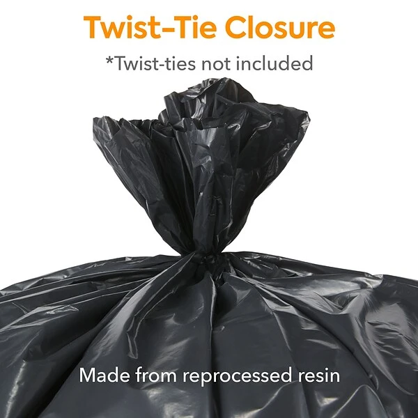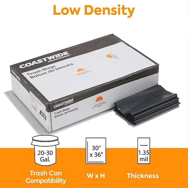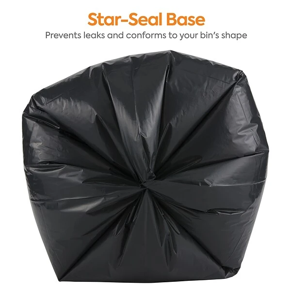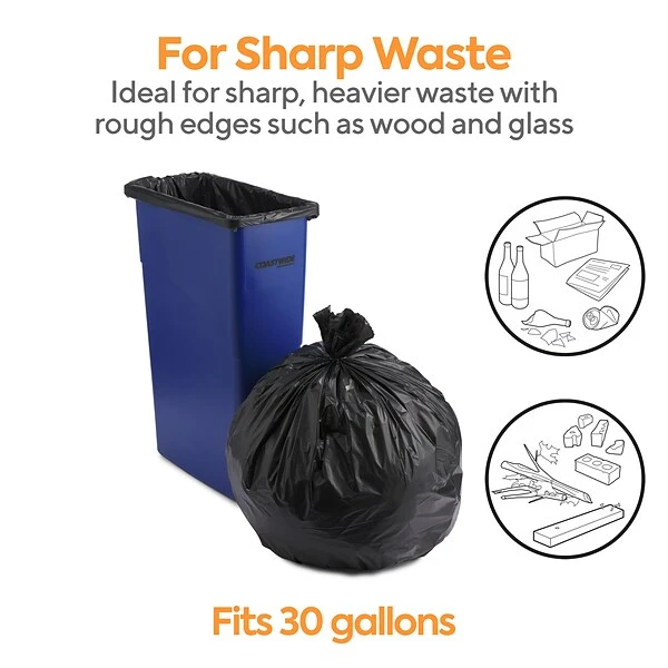 Keep your kitchen clean and free of clutter with these black trash bags. The super heavy-strength prime resin construction offers lasting durability and easily handles office and kitchen waste, and the 20-30 gallon size fits in most large trash receptacles. These Coastwide Professional™ 20-30 gallon reprocessed resin trash bags have star-sealed bottoms, stopping liquids and food waste from leaking out.