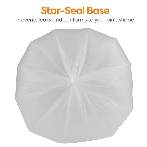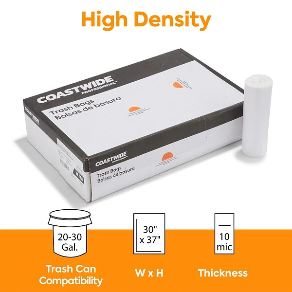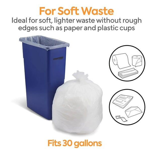 Collect garbage in breakrooms and other shared spaces with these trash bags. The high-density construction provides good lifting strength for easy transportation to ensure safe, reliable disposal, while the natural color provides a view of the contents to avoid theft. These Coastwide Professional™ natural trash bags are packaged in a carton of 500 to provide an ample supply, and the 20 to 30-gallon capacity is ideal for public places.