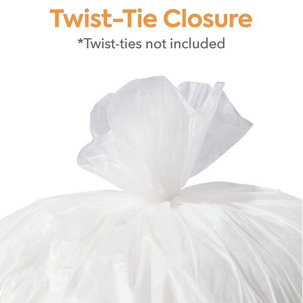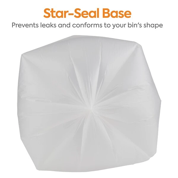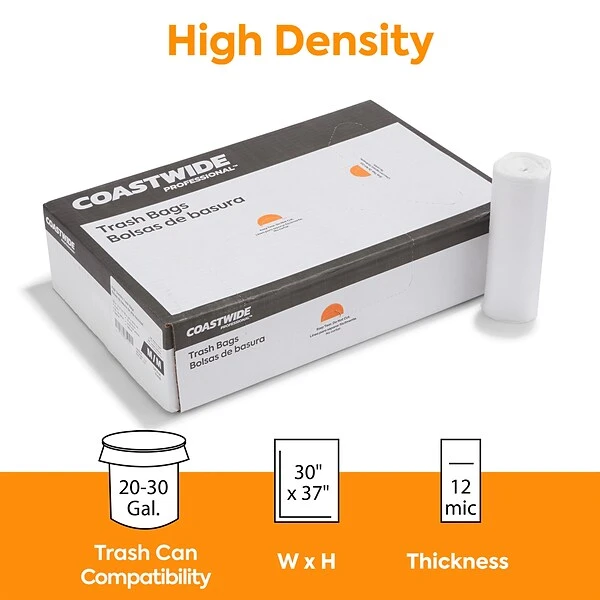 Stock the supply closet with these sturdy trash bags. A narrow carton facilitates vertical or horizontal storage, and coreless packaging allows one-at-a-time dispensing. High-density plastic construction contains paper objects, and the star-sealed bottom helps level trash, so bags slip out of the waste bin without rupturing. These Coastwide Professional 20 to 30-gallon trash bags feature a natural resin build for easy viewing before disposal, eliminating loss.