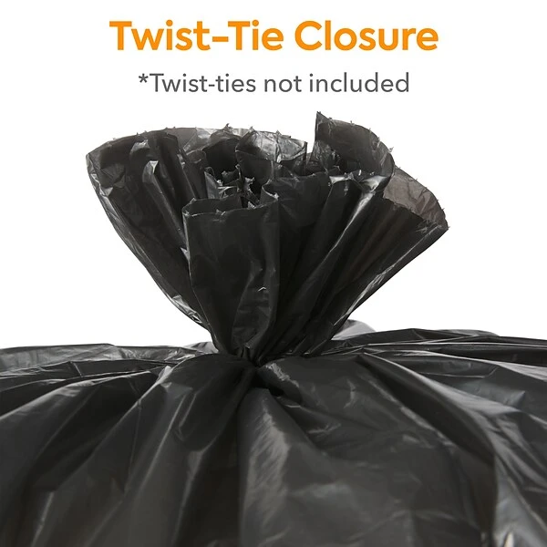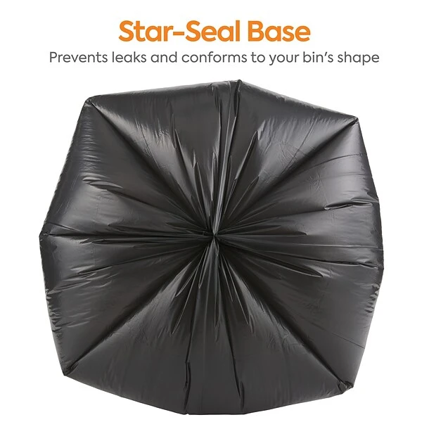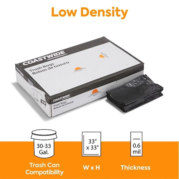 Take care of bulky refuse with these heavy-strength trash bags. The opaque black color keeps the contents hidden from sight to ensure discretion, while the low-density plastic resists stretching to avoid leaks and spills. With a 30 to 33-gallon capacity, these star-sealed Coastwide Professional™ 0.6-mil trash bags provide ample space for garbage, and the 250-count carton meets the demands of busy environments.