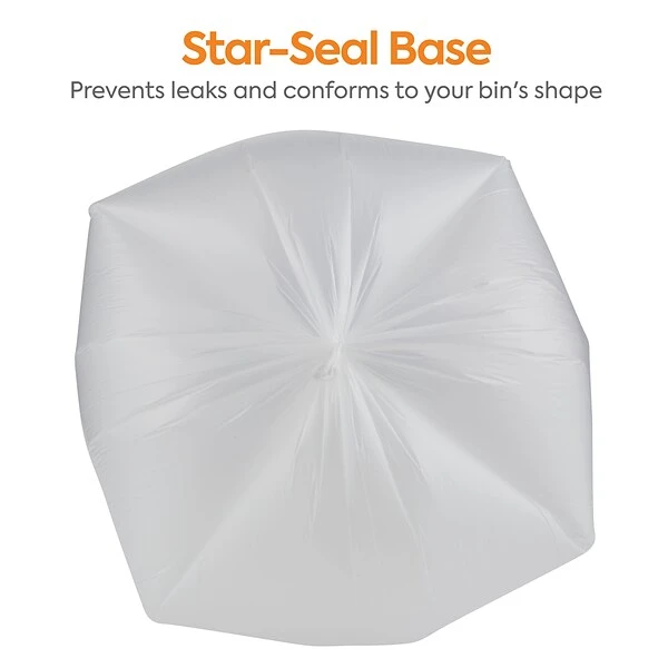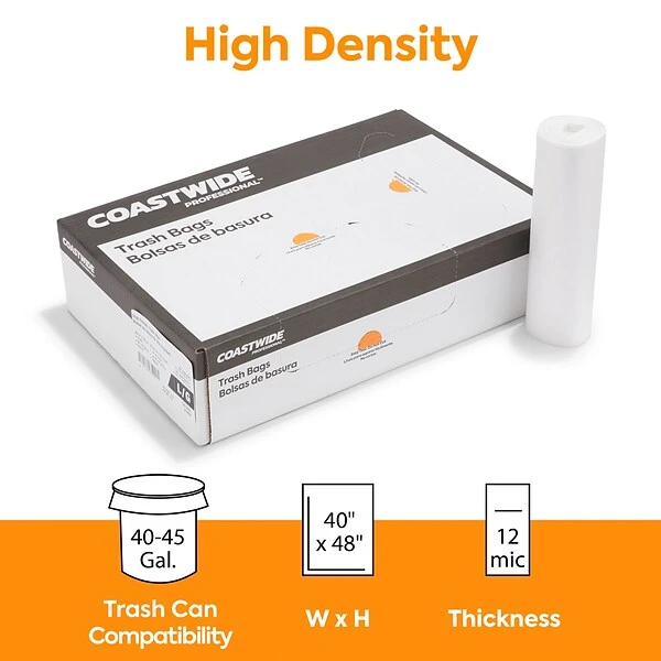 Practice responsible waste management with these medium-strength transparent trash bags. This carton of 250 comes in 25 pieces per 10 rolls for easy distribution, and the 0.47-mil thickness offers a higher load capacity. These Coastwide Professional™ natural high-density trash bags fit recycling bins with a capacity of 40-45 gallons for use in busy commercial kitchens, office buildings and public areas.
