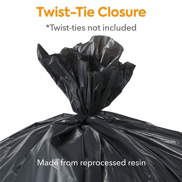 Load up your janitorial closet with this 100-count carton of trash bags. Each one holds up to 56 gallons for businesses that go through lots of garbage, while the star-sealed bottom helps prevent leaks when removing wet trash from office restrooms. The black coloring keeps contents hidden for a more pleasing look. These Coastwide Professional™ trash bags are made of reprocessed resin for added sturdiness and support.