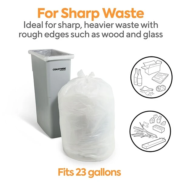 Get rid of refuse from the break room, washroom or other shared spaces with these AccuFit trash bags. The clear material delivers a view of the contents, helping prevent theft, while the low-density polyethylene prevents heavy items from stretching and ripping to avoid leaks, making them suitable for cafeterias and public areas. These Coastwide Professional™ AccuFit trash bags hold up to 23 gallons of waste as an effective maintenance solution.