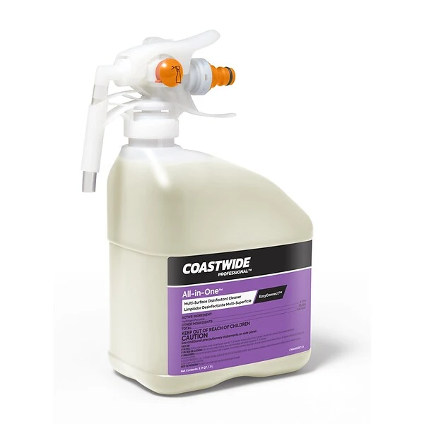 Kill germs and remove stubborn messes with this all-in-one cleaner. Powerful hydrogen peroxide disinfectant provides an ideal solution for hospital rooms, classrooms and dining areas, while the strong cleaning agents help cut through dirt to leave your building looking its best. The 3-liter bottle is compact for convenient storage and portability. This cleaner is available in a pre-tipped dispensing bottle to ensure you consistently get the right dilution ratio for the best results. This Coastwide Professional™ All-In-One disinfectant cleaner features an ergonomic handle for easy dispensing and less mess.