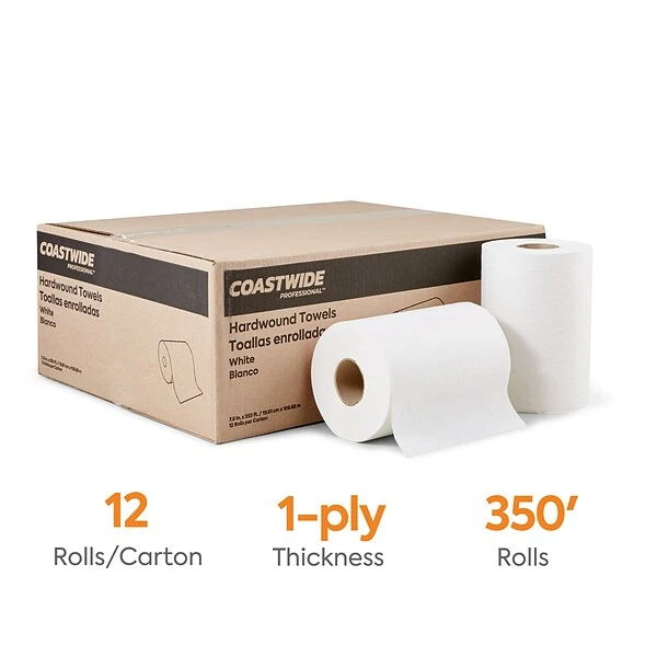 Keep these Coastwide Professional™ hardwound towels in stock for drying hands and wiping up moisture. These one-ply paper towels are strong and durable for wiping up spills or cleaning fluids, but are soft for drying hands on a frequent daily basis. Each roll in this 12-carton features 350 feet of white one-ply paper towels, ideal for use in restrooms or anywhere spills occur. With a 2-inch core and 7.8-inch width, these Coastwide Professional™ white hardwound paper towel rolls are designed to fit most universal towel dispensers.