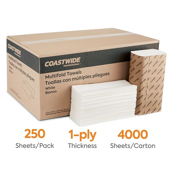 Designed for use in commercial workplaces and public restrooms, these Coastwide Professional one-ply paper towels fit neatly into dispensers for convenient access. Simply remove the outer wrapping on each bundle and place the towels in your dispenser. Add these sturdy, absorbent sheets in breakrooms and dining areas to clean up spills, or keep them in the office’s restrooms to promote cleanliness in the workplace. Each package contains 4,000 folded paper towels, which ensures a plentiful supply for your office. This reduces the amount of time spent reordering supplies, so you can focus on more important day-to-day operations.