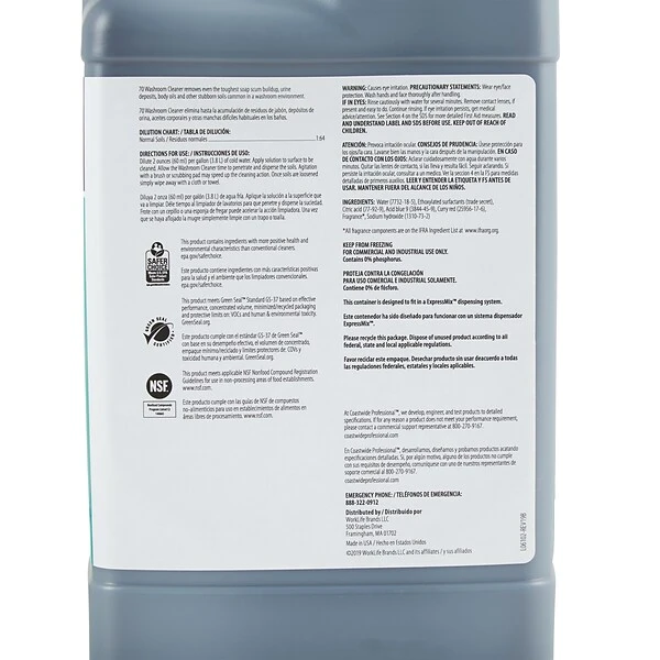 Equip your janitorial cart or closet with a powerful cleaning formula when you use this washroom cleaner. The unique blend of ingredients works to remove body oil, water scale, and soap scum, leaving tile, ceramic, porcelain, and other bathroom surfaces gleaming and bright. This Coastwide Professional 70 Washroom Cleaner is compatible with ExpressMix dispensers, creating a quick solution for diluting and dispensing.