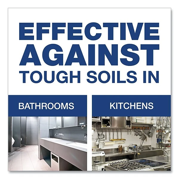 A unique two-in-one all purpose cleaner that combines the cleaning power of heavy-duty detergents with the stain-removal power of bleach. Contains patented cleaning technologies and no abrasives to clean the full range of tough kitchen and restroom soils like tracked-in dirt and scuffmarks. Task areas include customer and employee restroom surfaces, kitchens, the inside and outside of plastic trash containers, and greasy equipment containers.