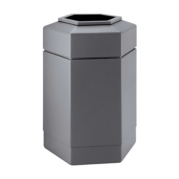 The gray, PolyTec Series 30 Gallon Hex Waste Container has a unique, stream-lined appearance that offers medium capacity and convenient ease-of-use. The patented Grab Bag system secures the trash bag in place for a cleaner appearance with a decreased chance of the lid blowing off. These heavy-duty waste containers are designed to withstand the harshest environments as well as offer easy maintenance. Environmentally friendly containers are molded from long-lasting recycled polyethylene. They won’t rust, dent or chip.