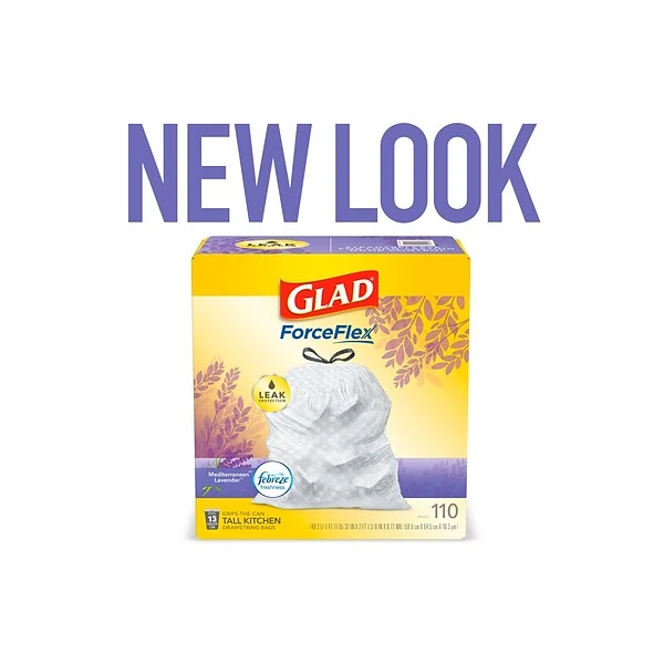 Fight nasty kitchen odors with Glad® trash bags and the steady release of Febreze freshness. Glad® Tall Kitchen Drawstring Trash Bags are designed with ForceFlex technology to give extra flex as it expands around sharp edges and heavy loads, so you can pack it in while resisting tears, rips and punctures. A steady release a Mediterranean Lavender scent with Febreze Freshness keeps your kitchen pleasantly fresh smelling with long lasting odor control. Let the stretchable strength of Glad® handle all the messes our busy daily life can throw at it and then some. With double-sided seals and a reinforced bottom, these bags are designed with RipGuard® and LeakGuard® technology to prevent seepage of liquids and keep trash contained. The durable Grips-The-Can Drawstring ensures a tight grip on the trash can to keep it in place. Take the trash to the curb with no fear of leaks and tears, and no frustration. Keep your kitchen smelling clean with the stretchable strength of Glad®. Ideal for use in offices, schools, daycare centers, restaurants, hotels and other commercial facilities.
