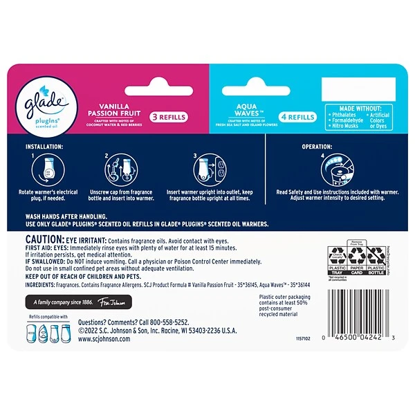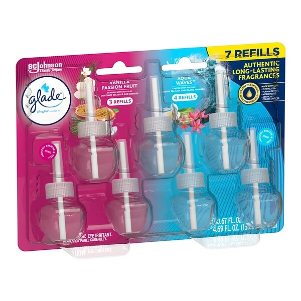One size really does fit all. Creating the perfect mood is just an outlet away with the Glade PlugIns Vanilla Passion Fruit and Aqua Waves scented oils. Simply fill the scented oil warmer with a refill, and plug it in to freshen a room with long-lasting scent (up to 50 days on low setting).