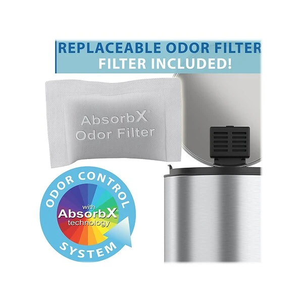 This iTouchless SoftStep trash can features a versatile round shape and space-saving design that make it perfect for the kitchen. The can is made of elegant fingerprint-proof stainless steel and comes with an AbsorbX natural carbon odor filter.