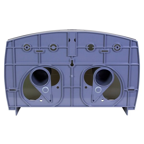 Maintain a professional presentation in the bathroom with this tissue dispenser. This spacious device fits either two 9.38-inch rolls or one 13-inch roll, providing an ample amount of tissue. The smoke-gray transparent design adds a sleek look to office bathrooms, while the plastic body endures heavy usage. This Kimberly-Clark Professional cored JRT bathroom tissue dispenser features a hinged front cover and a push button for easy loading and a common key lock for added security.