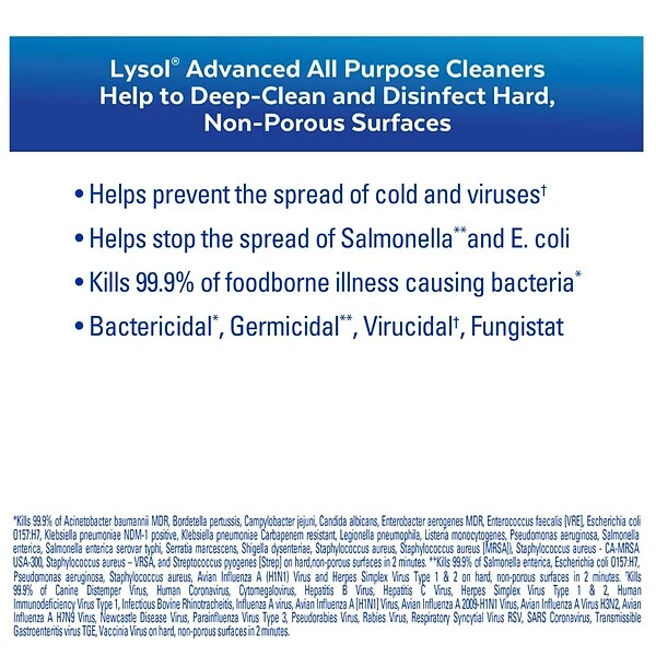 Lysol Advanced Deep Clean All Purpose Disinfecting Cleaner helps to deliver fresh, deep-cleaned, and sanitary surfaces. With 50% more cleaning power, it powers through the toughest cleaning jobs, cutting through tough grease and soap scum, and eliminating 99.9% of viruses and bacteria to help provide peace of mind for families and facilities.