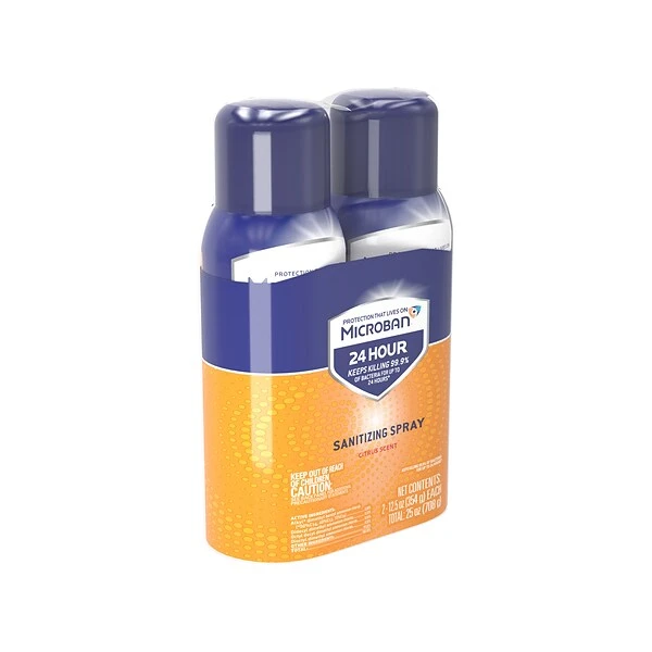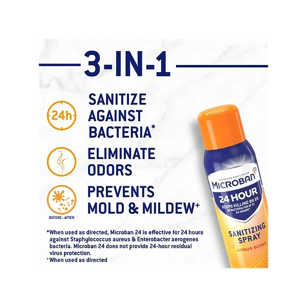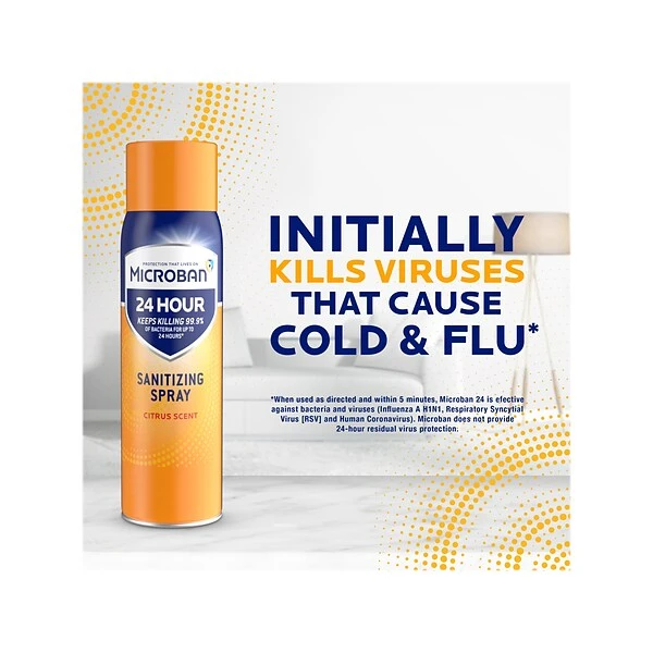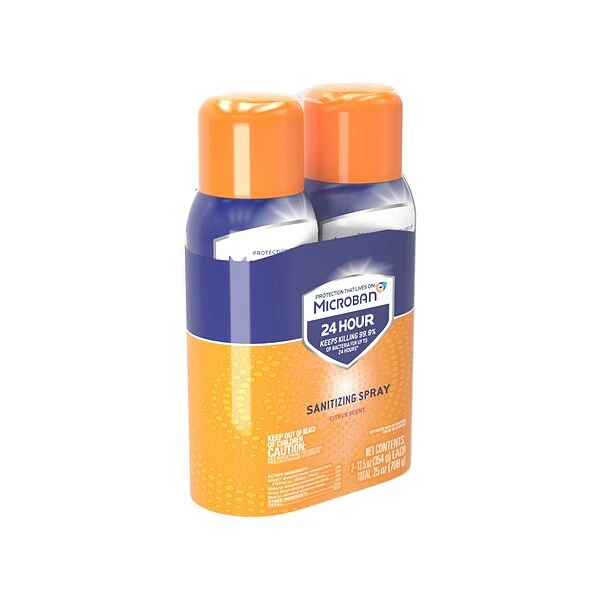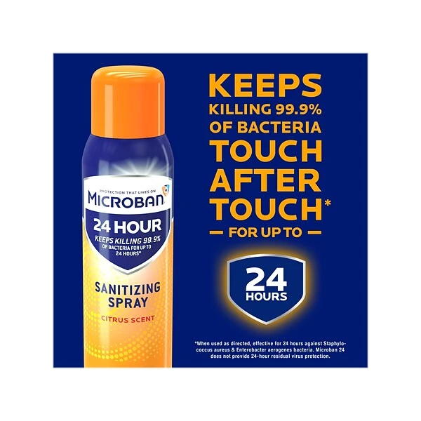 The Microban 24 sanitizing spray kills 99.9% of bacteria and continues working throughout the day to provide long-lasting protection for surfaces. Microban 24, the sanitizing spray four out of five doctors would use at home, is now available in a convenient travel size for peace of mind on the go. This three-in-one cleaner sanitizes for 24 hours, disinfects, and eliminates odors. It is also approved to initially kill the virus that causes COVID-19. It can be used on a variety of hard non-food-contact surfaces as well as soft surfaces.