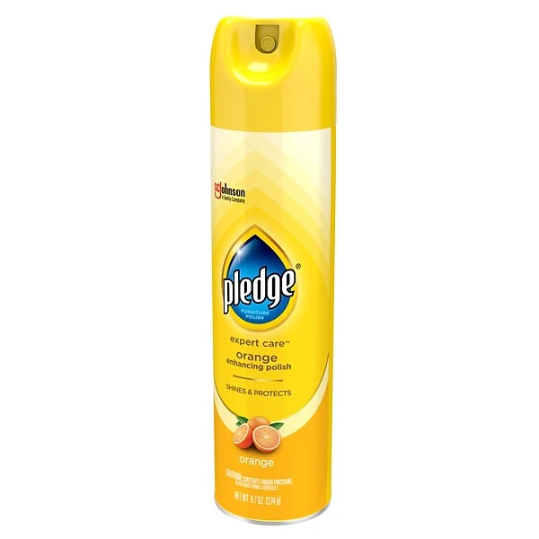 Protect furniture with this polish spray. The aerosol formula delivers a cleaning, moisturizing action to remove dust allergens and bring out the shine of wood. The orange scent of this Pledge polish spray leaves a refreshing fragrance.