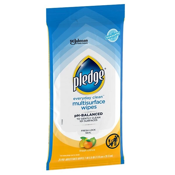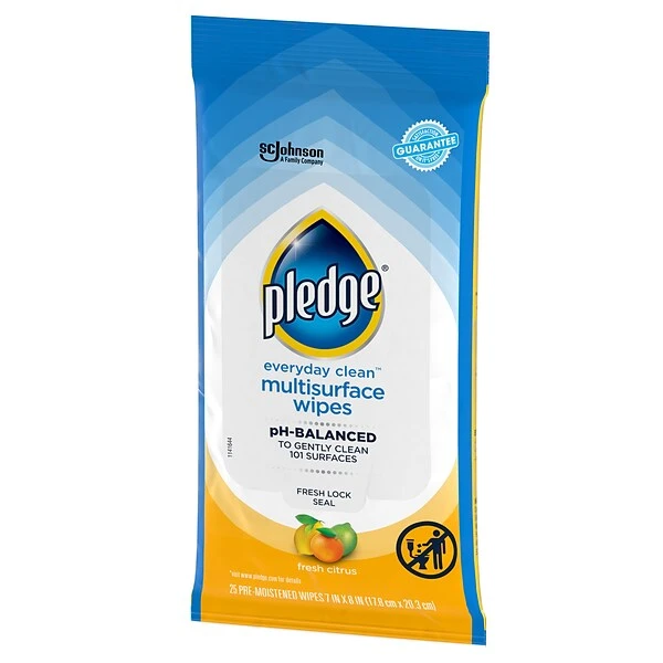 Remove dust, dirt, and other grime quickly and easily with these disposable wipes. These versatile wipes come in a resealable 25-pack and can be used to clean up many surfaces including wood, glass, and electronics without leaving annoying streaks behind. Each of these Pledge multisurface wipes is scented with a fresh citrus aroma that leaves the area with a pleasant fragrance.