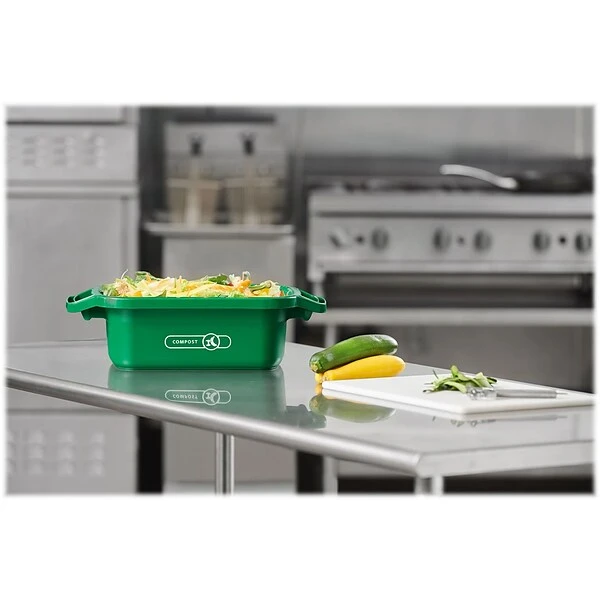 The Rubbermaid compost system ensures effective compliance with growing food waste diversion regulations. The compost bin fits on top of the counter for easy access, is freezer-safe, nests for efficient storage, and is dishwasher-safe for quick cleaning.