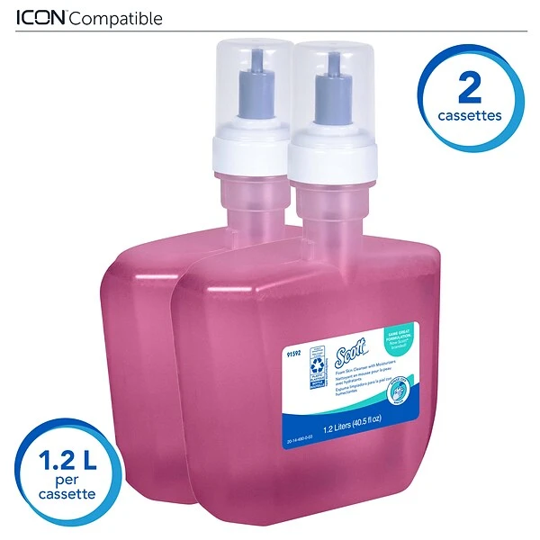 Stock bathroom vanities and kitchen sink areas with this foam skin cleanser. A light floral fragrance leaves behind a pleasant scent, while the added moisturizers prevent skin from becoming dry due to frequent washing. Each pump delivers a luxurious foam, providing guests and staff with a premium skincare experience. This Scott Pro skin cleanser comes in a sealed container for improved sanitation and is compatible with a range of Kimberly-Clark commercial soap dispensers for quick, easy installation.