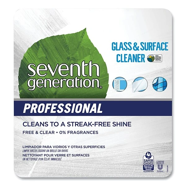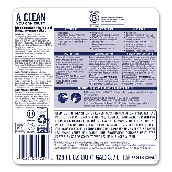 Plant-based formula cleans to a streak-free shine. Put a sparkle on your windows, mirrors, and stainless steel. Made with 0% Volatile Organic Compounds (VOCs), dyes or fragrances. Bottle is made with 80% Post-Consumer Recycled (PCR) plastic. Safe for use on glass, acrylic, aluminum, ceramic, chrome, fiberglass, Formica, laminate flooring, mirror, nickel, porcelain, stainless steel, travertine, vinyl sheet flooring, wood (with lacquer, oil-based paint, water-based paint, polyurethane, shellac, unfinished). Safe for use with caution on concrete, Corian, granite (sealed and unsealed) and marble (sealed and unsealed). Ideal for commercial and business use including restaurants, offices, school, day care facilities, and hospitality.