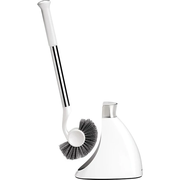 The simplehuman toilet brush has a specially designed crescent shape to reach hard-to-clean areas around the rim. A unique magnetic collar secures the cover to the toilet brush so you can carry them together without any drips. The slim, dome-shaped cover conveniently stores the toilet brush when not in use, keeping it hygienic and discreetly hidden.