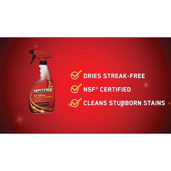 Spitfire® Professional All Purpose Power Cleaner is safe, powerful and gets the job done when other cleaners can’t. Removes ink, crayon, marker, adhesive, gum, food soils, scuff marks, grease, oil and daily soil buildup from any washable surface. Add some fire power to your cleaning program with Spitfire.