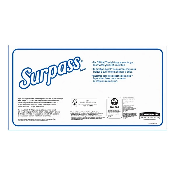 Place boxes of these 2-ply tissues throughout residential, school, healthcare, or office spaces to help avoid the spread of germs and keep runny noses comfortable. This case contains 30 boxes of 100 soft, durable tissues each to help get everyone through colds and allergies. These Surpass facial tissues are differently colored near the end of the box to indicate when it’s time to resupply.